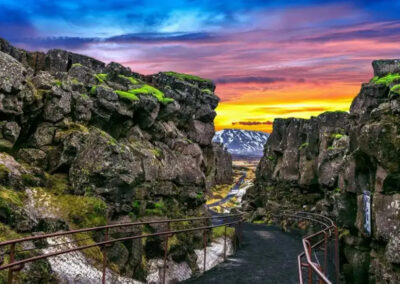 Thingvellir to szeroka dolina tektoniczna, gdzie dosłownie widać pęknięcie skorupy ziemskiej. Surowe skały tworzą naturalne ściany, pomiędzy którymi prowadzą ścieżki spacerowe. W tle rozciąga się jezioro Þingvallavatn, największe na Islandii, często spokojne i niemal lustrzane.