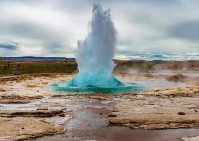 Obszar Geysir to intensywnie „żywa” ziemia. Gorąca woda bulgocze pod stopami, para unosi się z licznych otworów w ziemi, a Strokkur regularnie wyrzuca słup wrzątku w powietrze. To miejsce najlepiej oddaje pojęcie „krainy ognia i lodu”.