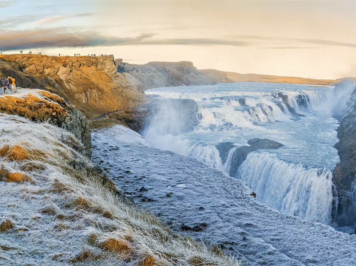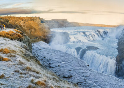 Gullfoss to potężny wodospad wpadający do głębokiego kanionu. Hałas wody, mgła unosząca się nad przepaścią i ogrom przestrzeni robią wrażenie niezależnie od pogody.