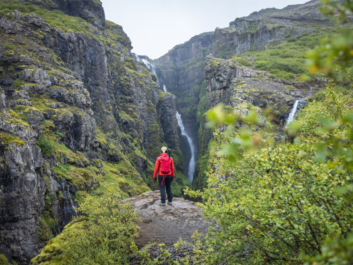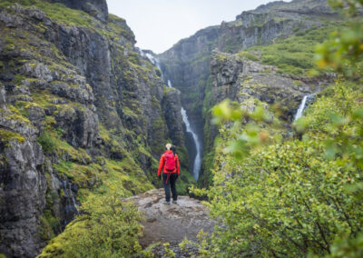 Glymur to wędrówka przez wąwóz, z przekraczaniem rzeki i stromymi podejściami. Wodospad spada z ogromnej wysokości, a widoki z góry pozwalają zobaczyć fiord i ocean w oddali. To jedno z bardziej „alpejskich” doświadczeń na Islandii.