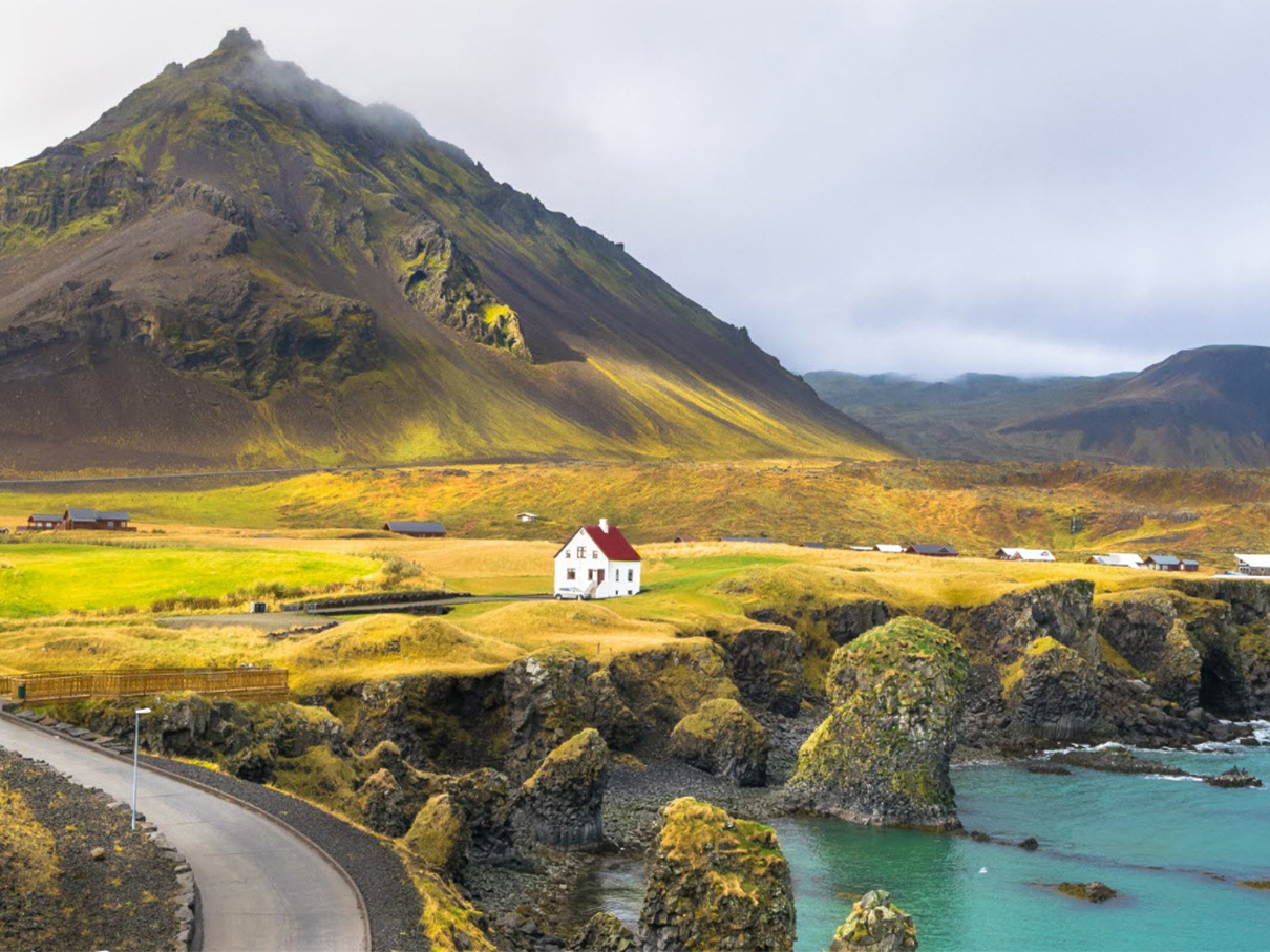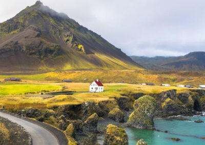 Arnarstapi to spokojna wioska rybacka położona na klifach. Spacer wzdłuż wybrzeża prowadzi przez naturalne łuki skalne, bazaltowe kolumny i miejsca, gdzie fale rozbijają się bezpośrednio pod stopami.
