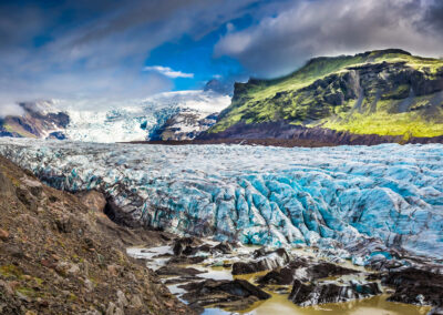 W rejonie Vatnajökull widać jęzory lodowców schodzące nisko w doliny. Cisza, chłód i ogrom lodu robią bardzo silne wrażenie.