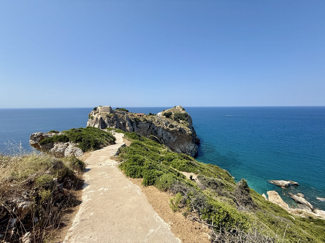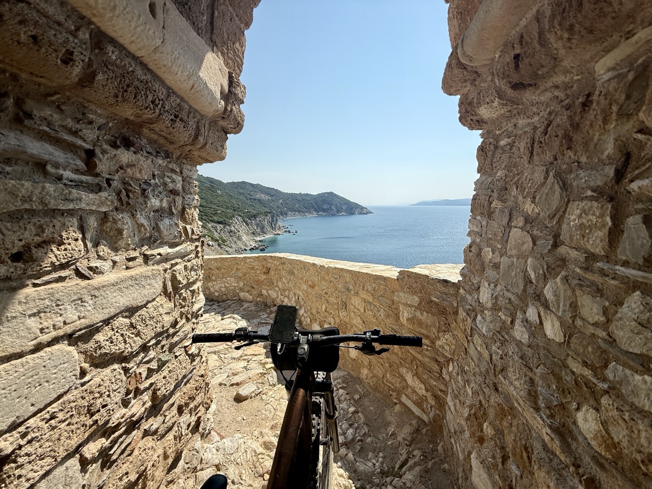 To jeden z najbardziej widowiskowych odcinków – zielone zbocza, widok na morze i cisza nieturystycznej Grecji.