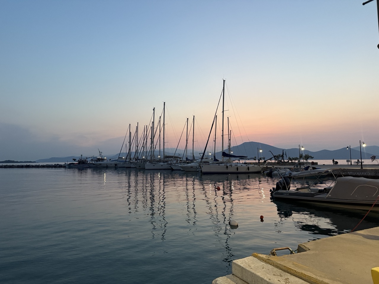 Wypływamy o zachodzie słońca – morze mieni się złotem, a wokół rozlewa się grecki spokój.