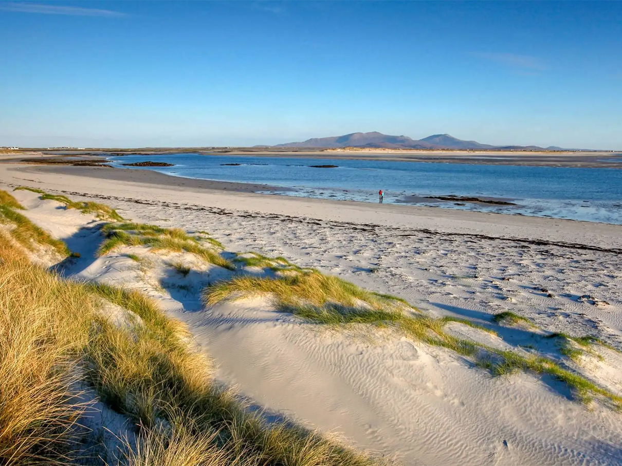 Jezioro Loch Morlich – jasna plaża w otoczeniu gór